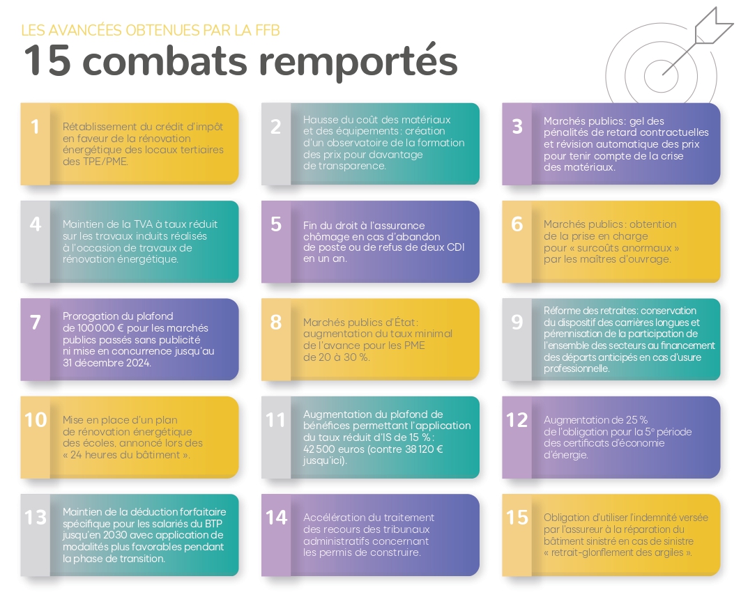 FFB Nationale9:0027/06/2023Lors des élections législatives de 2022, la FFB a rassemblé l'ensemble des attentes formulées par les professionnels et publié une liste de 85 propositions à atteindre au cours de la mandature. Cette feuille de route est suivie mois après mois. En un an, de juin 2022 à juin 2023, nous avons obtenu 15 avancées dans de nombreux domaines. Elles sont le résultat de la mobilisation constante du réseau et de ses mandataires.