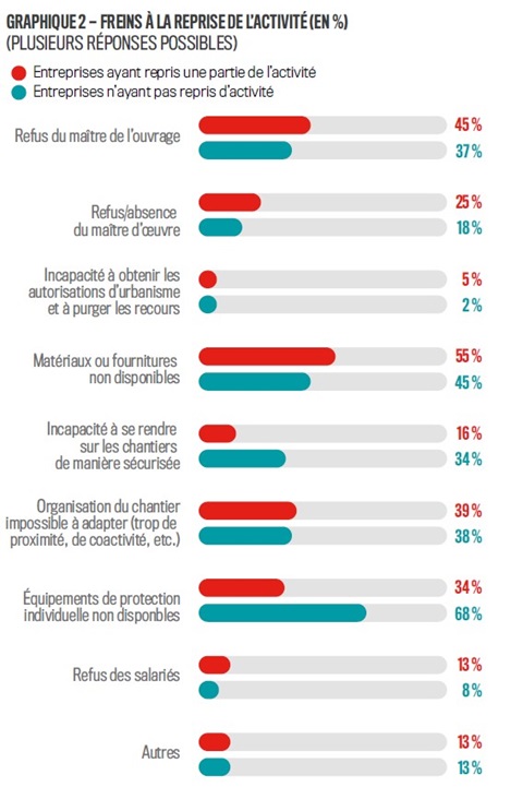 Parmi les principaux freins à la reprise décrits par les entreprises (cf. graphique 2), on relève l’indisponibilité des équipements de protection individuelle (34 % pour les entreprises ayant repris une activité et 68 % pour les autres), puis les ruptures d’approvisionnement en matériaux (respectivement 55 et 45 %). Viennent ensuite les refus du maître de l’ouvrage (respectivement 45 et 37 %).