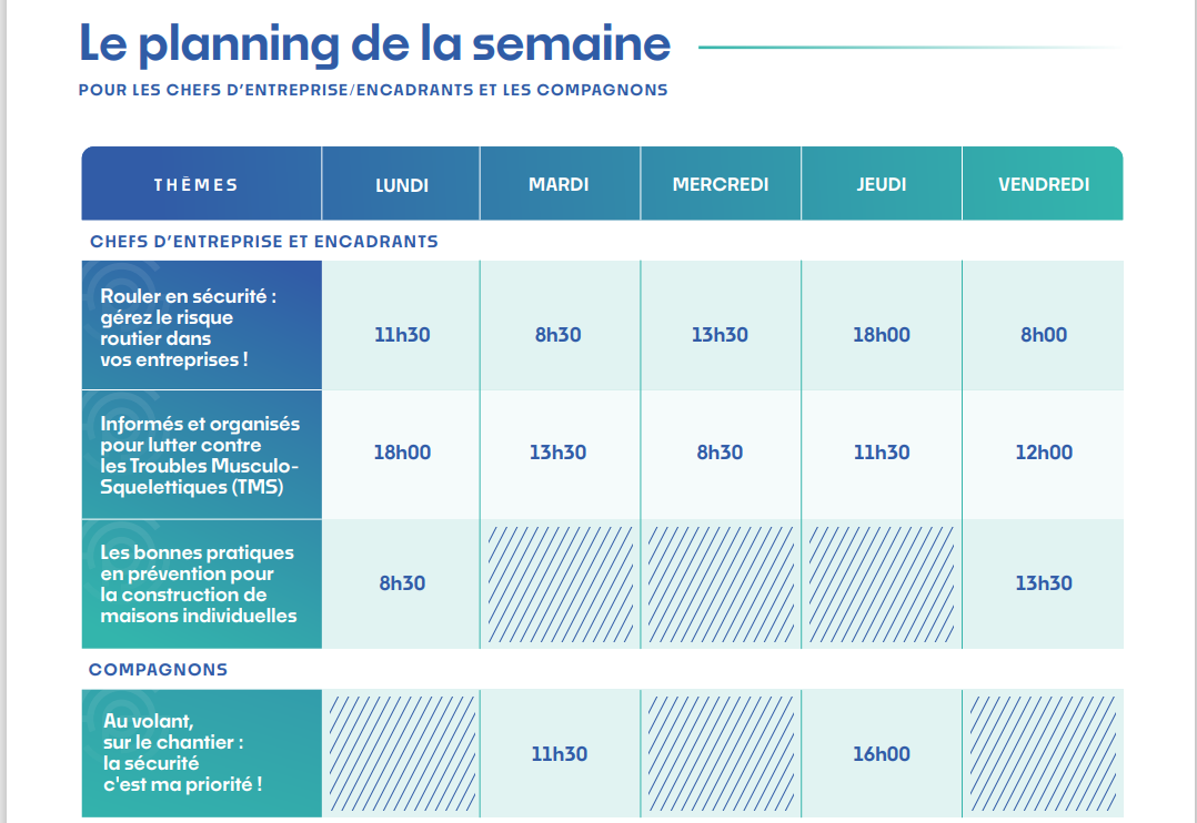 La semaine de la Prévention est un dispositif 100% digital proposé par la FFB qui repose sur un programme de webinaires santé-prévention à la carte pour tous les chefs d’entreprise, l’encadrement et les compagnons.
