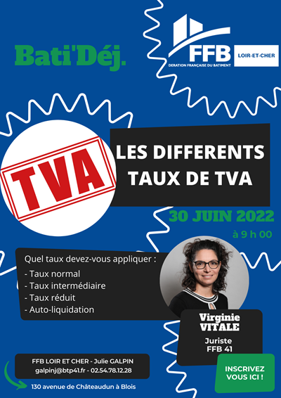 Nous vous convions Le Jeudi 30 Juin à 09H, à la FFB du Loir-et-Cher pour une réunion conviviale sur les différents taux de TVA.