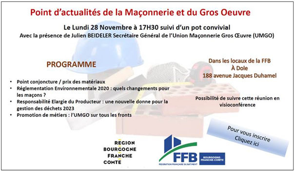 La FFB BFC et la Fédération BTP 39 ont le plaisir de recevoir Julien BEIDELER, Secrétaire Général de l'UMGO (Union Maçonnerie Gros Oeuvre) pour évoquer l'actualité du secteur.