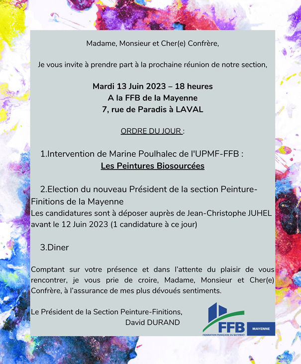 David DURAND, Président de la section peinture-finitions vous invite à prendre part à la prochaine réunion de la section, le Mardi 13 juin 2023 à 18h00 à la FFB Mayenne.
