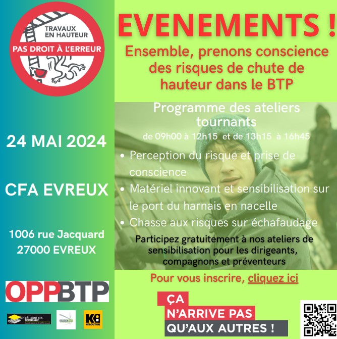C'est pourquoi, l'OPPBTP lance une campagne d'information sur ce risque ! C'est dans ce cadre que plusieurs évènements départementaux, sur toute la France vont être organisés. Dans l'Eure, ce sera le vendredi 24 mai au CFA d'Evreux.