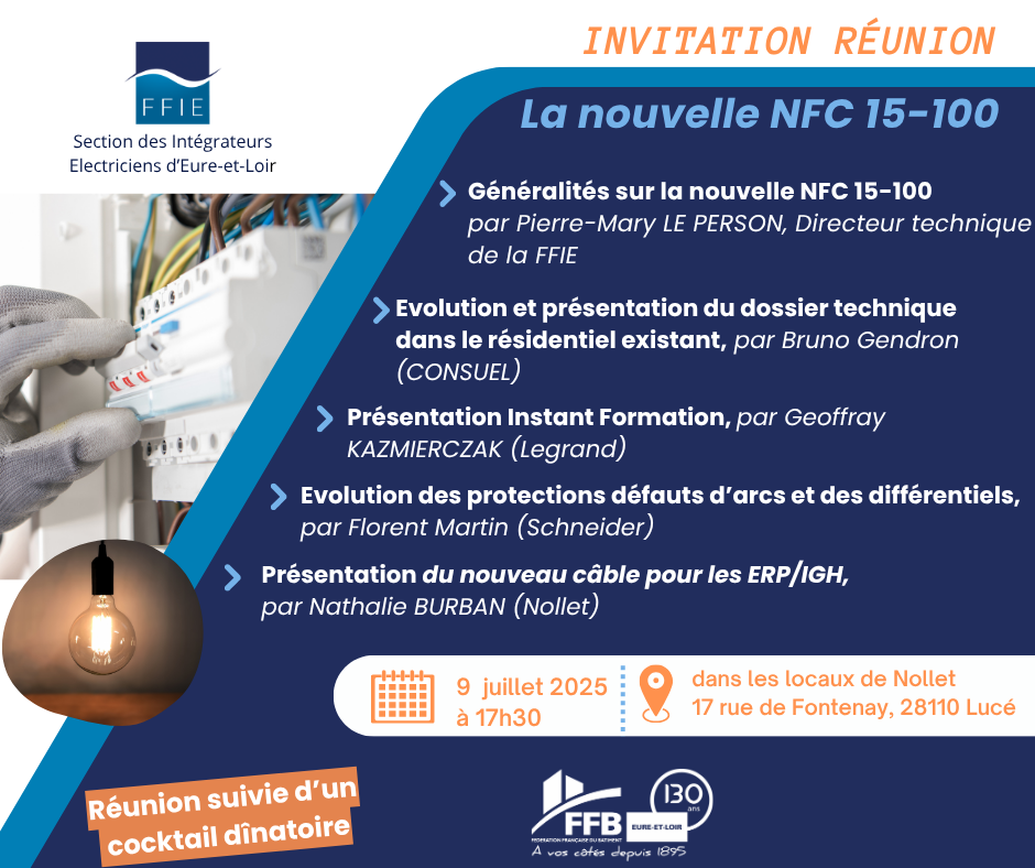 La section intégrateurs électriciens de la FFB 28 vous invite à une réunion concernant la nouvelle NFC15-100 dans les locaux de Nollet à Lucé à partir de 17h30.