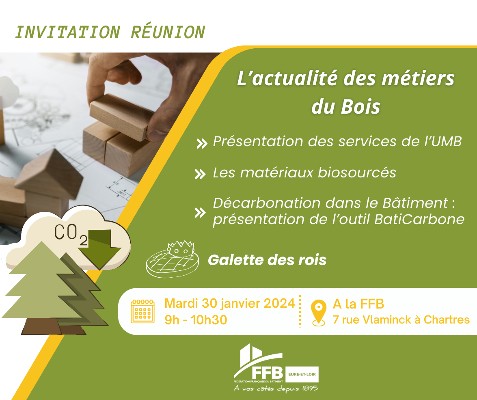 L'Union des Métiers du Bois 28 organise une réunion l'actualité des métiers le mardi 30 janvier à 9h à la FFB à Chartres.