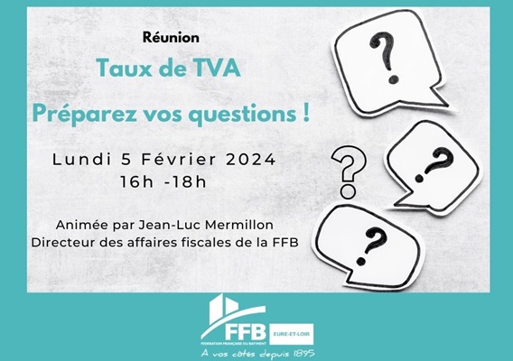 Pour répondre à toutes vos questions, la FFB vous propose une réunion sur : Quel taux de TVA appliquer sur vos chantiers le lundi 5 février 2024 à 16h.