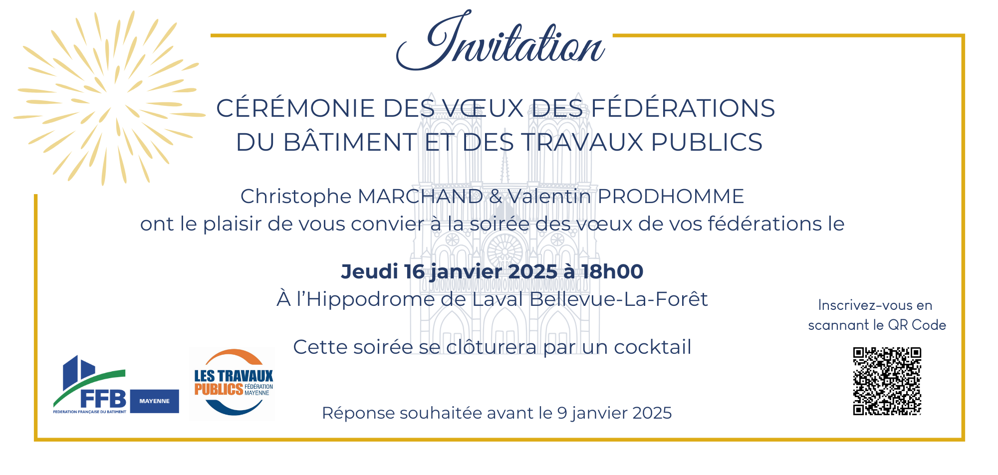 Christophe MARCHAND et Valentin PRODHOMME ont le plaisir de vous convier à la soirée des vœux de la Fédération du Bâtiment et de celle des Travaux Publics.