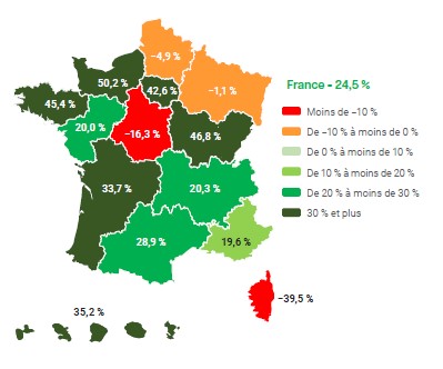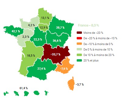 Hormis la Bretagne et les Pays de la Loire, toutes les régions enregistrent une baisse de leur volume d’activité en glissement annuel sur le premier trimestre 2025.