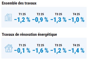 Plus récemment, entre les quatrièmes trimestres 2024 et 2025, la production d’ensemble conserve ce rythme de baisse, malgré une accentuation du recul en rénovation énergétique, à −1,4 %, du fait du logement (−1,7 %) alors que le non-résidentiel résiste (−0,3 %). À l’horizon de la fin du premier trimestre 2026, les perspectives se dégradent encore.