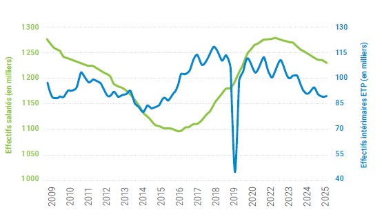 En moyenne sur 2025, hors non-salariés, le secteur perd un peu plus de 20 000 emplois, dont 18 000 salariés. Toutefois, la baisse des effectifs se tasse un peu en glissement annuel sur le quatrième trimestre 2025, avec la destruction de 17 200 postes. Pour les prochains mois, les chefs d’entreprise employant plus de dix salariés ne se montrent pas trop inquiets pour les effectifs salariés du secteur.