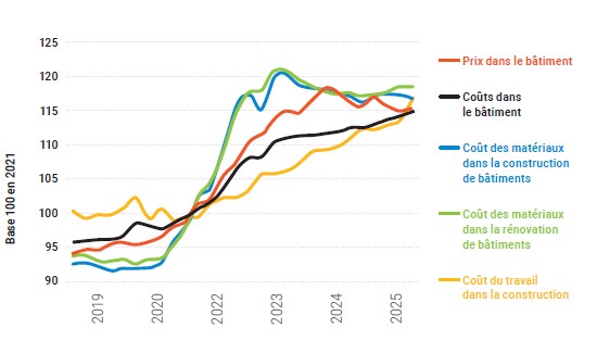 Les prix du bâtiment abandonnent 1,1 % en 2025, pénalisés par ceux du neuf (−3,9 %) alors que ceux de l’entretien-amélioration progressent encore (+1,0 %). Dans le même temps, les coûts augmentent de 1,6 %, sous l’effet de la hausse de celui du travail (+3,1 %), tandis que ceux des matériaux s’avèrent quasi stables, même si les demi-produits en cuivre ou en alliage connaissent une nouvelle envolée de leurs prix en sortie d’usine, avec +49,7 % entre août 2025 et février 2026.