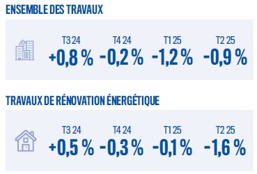 L’entretien-amélioration confirme sa baisse, à −0,9 % pour l’activité en volume entre les deuxièmes trimestres 2024 et 2025, pénalisé au premier chef par le logement (−1,0 %), le non-résidentiel se repliant plus faiblement (−0,6 %). Sur le seul segment de la rénovation énergétique, le logement amplifie largement son recul (−2,1 %), alors que le non-résidentiel résiste (+0,5 %).