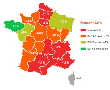 Hormis la Bretagne, les Pays de la Loire et le Grand Est, toutes les régions enregistrent une baisse de leur volume d’activité d’ensemble.