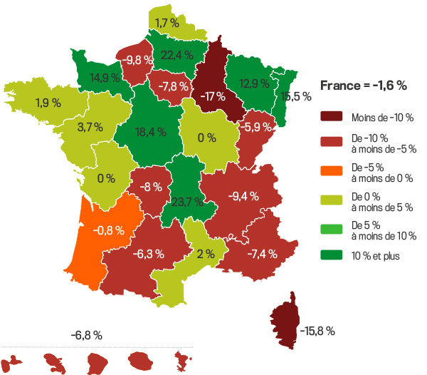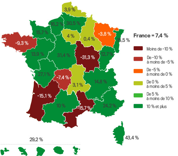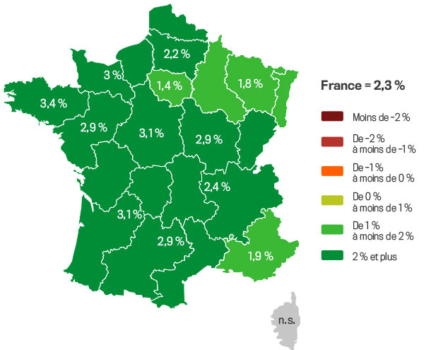 Toutes les régions enregistrent une hausse de leur activité en glissement annuel sur le troisième trimestre. Les progressions les plus importantes, d’au moins 3,0 % hors effet prix, s’observent en Bretagne, Centre-Val de Loire, Nouvelle-Aquitaine et Normandie. À l’opposé, l’Île-de-France ferme la marche, à +1,4 %.