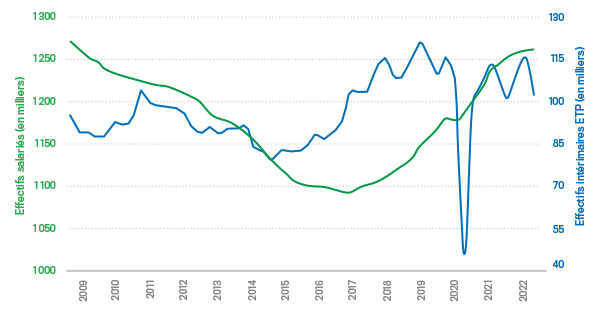 Environ 15 800 postes ont été créés dans le bâtiment entre les trois premiers trimestres 2021 et 2022, solde d’une hausse de 17 700 salariés et d’un recul de 1 900 intérimaires en équivalent temps plein. Toutefois, sur le seul troisième trimestre, l’emploi salarié se tasse, alors qu’à l’horizon de l’automne, les perspectives restent assez bien orientées, notamment dans les entreprises de plus de dix salariés, pour peu qu’elles trouvent la main-d'œuvre adéquate.