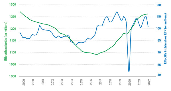 d’une hausse de 21 900 salariés et d’un recul de 1 900 intérimaires en équivalent temps plein (ETP).