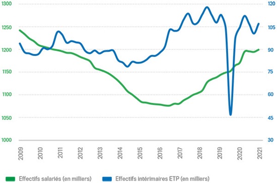 L’emploi salarié dans le bâtiment ressort très dynamique en 2021, avec respectivement 38 200 et 62 200 postes de plus sur un et deux ans. Quant à l’intérim, compte tenu de l’effondrement constaté lors du premier confinement de 2020, 19 600 équivalents temps plein ont été créés en 2021, sans toutefois permettre de retrouver le niveau d’avant-crise (-6 500). Au global, en 2021, les créations nettes d’emploi s’établissent à respectivement 57 800 et 55 700 postes par rapport à 2020 et 2019. Quant aux perspectives à l’horizon du printemps, elles s’améliorent encore pour l’heure, quelle que soit la taille de l’entreprise considérée.