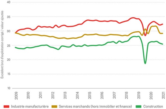 Sur le quatrième trimestre 2021, les marges opérationnelles, corrigées de la rémunération du travail des chefs d’entreprise non salariés, diminuent de nouveau pour s’afficher à 23,0 % dans la construction. Comparé au niveau d’avant-crise, l’écart se lit à -4,0 points de pourcentage (ppct). Il s’avère moindre dans l’industrie manufacturière (-2,7 ppct) et surtout dans les services marchands hors immobilier et finance (-0,8 ppct). Pour l’avenir, la situation pourrait se tendre davantage, avec des clients plus réticents à accepter de nouvelles hausses de prix, dans un contexte où ils devront mobiliser plus de ressources pour faire face à l’envolée des prix de l’énergie et de l’alimentation. Par ailleurs, les problèmes d’approvisionnement se renforcent et les prix des matériaux s’envolent à nouveau depuis le déclenchement de la guerre en Ukraine, alors même que le bâtiment doit faire face à une progression substantielle du poste salaires, du fait d’une accélération de l’inflation et de difficultés de recrutement toujours prégnantes.