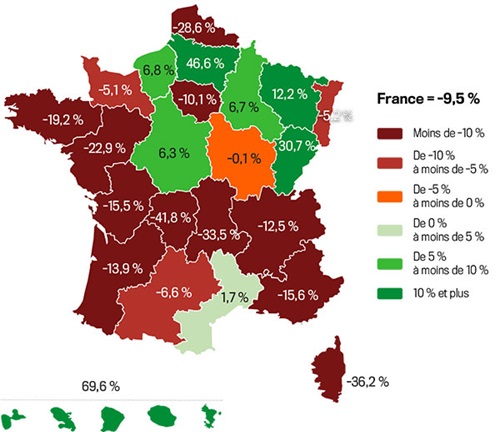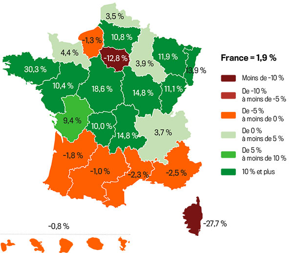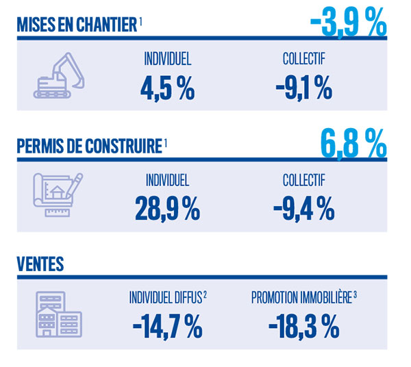 La situation du logement neuf ressort contrastée. De fait, en glissement bisannuel sur trois mois à fin février 2022, elle se dégrade côté mises en chantier, à -3,9 %, mais reste bien orientée côté autorisations, à +6,8 %, grâce à l’individuel qui s’envole de 28,9 %. Ce dernier segment a bénéficié d’un mois de février exceptionnel qui s’explique par l’afflux de dépôts de permis en décembre 2021 avant l’entrée en vigueur de la RE 2020. Toutefois, la contrepartie de ce mouvement s’observe d’ores et déjà dans l’effondrement des ventes de près de 15 % en cumul de décembre 2021 à février 2022 par rapport à la même période deux ans auparavant. Quant au collectif, il continue de reculer en ce qui concerne tant les mises en chantier (-9,1 %) que les autorisations (-9,4 %). Le non-résidentiel neuf reste également à la peine. Ainsi, en glissement bisannuel sur trois mois à fin février 2022, les surfaces commencées et autorisées abandonnent encore 3,8 % et 11,9 %. Seuls les bâtiments industriels et assimilés ainsi que les commerces ressortent en hausse ; tous les autres segments s’effondrant d’au moins 10 %.