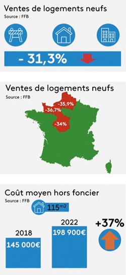 Ainsi, le journal 19/20 de France 3 indiquait : « Le recul est spectaculaire, il dépasse ce qu’on avait connu après la crise financière de 2008. Les ventes de logements neufs se sont effondrées de 31,3 % en 2022. Cela concerne aussi bien les maisons individuelles que les logements collectifs et aucune région n’est épargnée. Autre indice inquiétant, la forte hausse des annulations et des stocks de logements neufs. Concrètement il y a de plus en plus d’invendus.