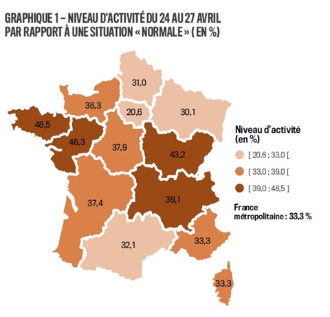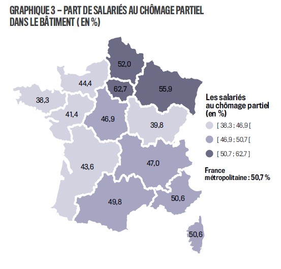 Près de 51 % des salariés du secteur du bâtiment se trouvaient au chômage partiel du 24 au 27 avril (cf. graphique 3). Là encore, les régions du Nord-Est ressortent les plus concernées, en particulier l’Île-de-France, où près de 63 % des salariés du bâtiment bénéficient du chômage partiel. Là toujours, la Bretagne s’en tire moins mal, avec 38 % de salariés au chômage partiel.