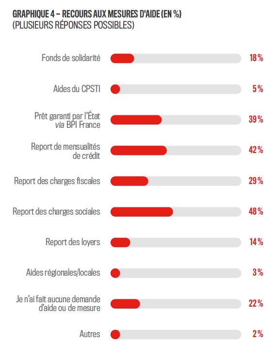 Les entreprises ont largement recouru (78 %) aux aides et mesures d’accompagnement (cf. graphique 4). Les trois principaux dispositifs sollicités s’avèrent le report des charges sociales (48 %), le report des mensualités de crédit (42 %) et le prêt garanti par l’État via BPI France (39 %).