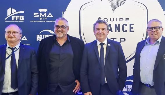 Le président de la FFB entouré (de gauche à droite) de Jacques Chanut, président de la SMABTP, de Christophe Urios, ancien joueur de rugby, entraîneur de l’ASM Clermont Auvergne et coach de l’équipe de France du BTP, et de Cyril Guy, pilote national FFB du groupe projet Worldskills.