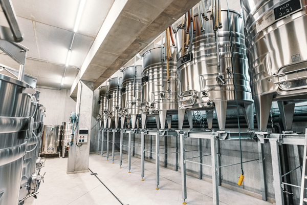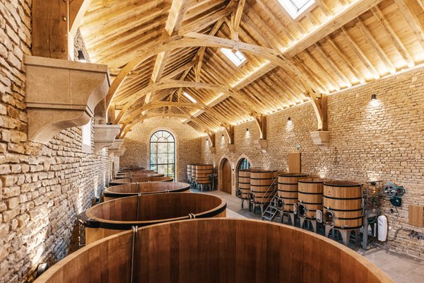 Après le décintrement réussi de la voûte – « elle n’a pas bougé d’un millimètre lorsque nous avons retiré le moule ! » se félicite Maxime Bauland –, les équipes ont pu se consacrer, au rez-de-chaussée, à la construction de la cuverie. Son vaste volume (9,70 m de hauteur sous faîtage) est mis en valeur par une charpente en chêne à l’ancienne, reposant sur une ossature structurelle en prémurs béton. L’assemblage de celle-ci a suivi un process très spécifique.