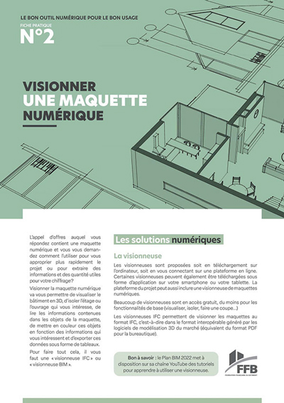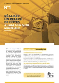 Cinq fiches sont déjà disponibles en ligne sur le site Internet de la FFB ; elles devraient être une douzaine à terme. À titre d’exemple, la première donne les clés pour réaliser un relevé de cotes à l’aide d’un outil numérique. La deuxième explore les solutions pour visionner une maquette numérique afin de s’approprier plus rapidement un projet ou pour extraire des informations et quantités utiles au chiffrage. La troisième, consacrée au partage de documents, vise à s’assurer qu’au bureau ou sur le chantier, les dernières versions numériques des documents à jour soient toujours accessibles.