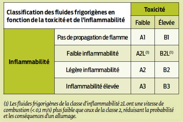 Le caractère toxique et/ou inflammable d’un fluide frigorigène contribue de façon évidente à la gravité des risques courus, en cas de fuite notamment. Pour en tenir compte, la norme NF EN 378-1 hiérarchise les fluides frigorigènes selon leur toxicité et inflammabilité en plusieurs classes de sécurité. La classe d’inflammabilité 2L y a été introduite.
