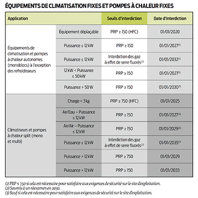 La réduction progressive des quotas de mise sur le marché est renforcée par de nouvelles restrictions, à court et moyen termes, pour certains équipements en fonction du type de fluide frigorigène fluoré qu’ils contiennent et de son PRP (voir tableau ci-dessous).