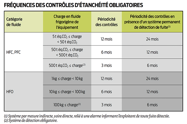 Sont ainsi concernés les équipements de réfrigération, climatisation, pompe à chaleur contenant des HFO dont la charge en fluide est supérieure ou égale à 100 kg ou contenants des (per)fluorés (SF6) ou nitriles fluorés dont la charge est supérieure ou égale à 500 t éq.CO2. En cas de fuite, le contrôle après réparation doit s’effectuer au plus tôt vingt-quatre heures après avoir fait fonctionner l’équipement et au plus tard un mois après.