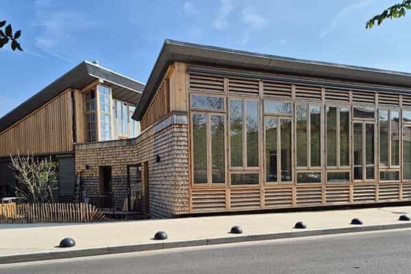 À l’arrière, la serre pédagogique, non chauffée, profite de la chaleur naturelle par sa double façade vitrée, entourée d’une coursive intérieure et extérieure en caillebotis acier, pour faciliter l’entretien et faire office de brise-soleil pour le rez-de-chaussée. Trois cheminées solaires jouent le rôle de ventilation naturelle intérieure, avec un système double flux. La façade se pare de tavaillons en châtaignier ou d’un enduit en terre crue.
