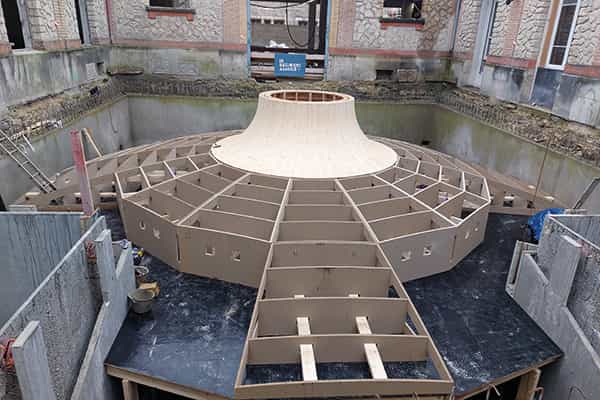 - réaliser un coffrage en bois, habillé de planchettes brossées. Contrainte supplémentaire, la coupole a dû être suspendue à de grosses poutres butons – un jardin, avec une lourde charge de terre, ayant été aménagé au-dessus.