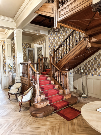 Et fastidieuse, puisqu’il a collé à lui seul les 33 rouleaux à la planche de 10 m chacun, soit plus de 300 m de long dans la cage d’escalier, l’entrée ou encore le vestibule du Petit Château, qui a retrouvé son motif de 1856.