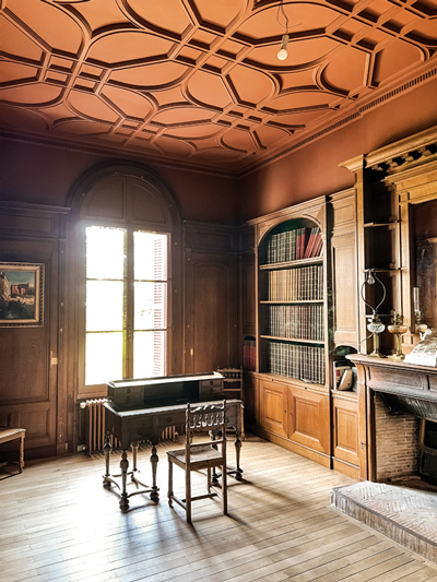 Un autre papier à la planche de l’Atelier d’Offard a habillé la salle de billard où, relate le jeune entrepreneur, « par contrainte de budget, un motif déjà reproduit d’un grand théâtre en Espagne de couleur rouge a été choisi. Il s’harmonisait avec le style néogothique du château ».