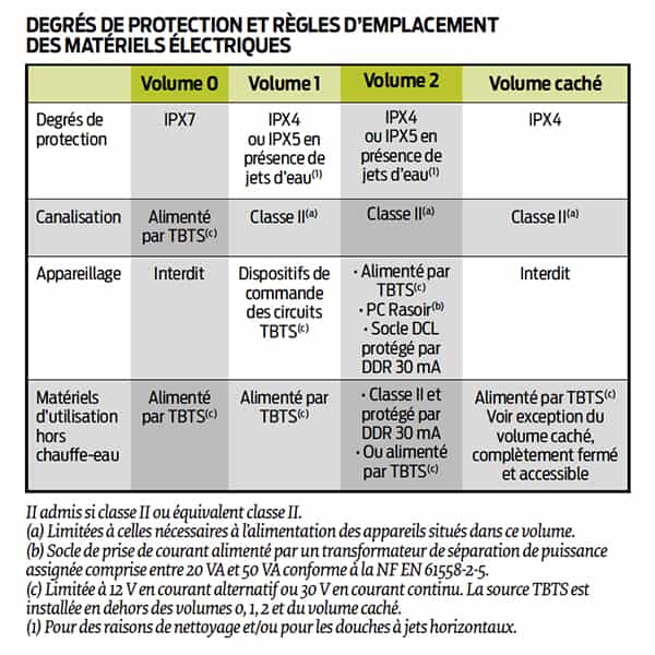 Toutefois, les armoires de toilette de classe II comportant un socle de prise de courant 2P + T peuvent être installées dans le volume 2 à condition que la partie de ces armoires comportant ce socle de prise de courant 2P + T soit située hors volume. Les degrés de protection des matériels ainsi que les règles d’emplacement sont rappelés dans le tableau ci-contre. Dans le volume 2, seuls peuvent être installés des matériels de classe II protégés par DDR 30 mA (dispositif à courant différentiel-résiduel) ou alimentés en TBTS.