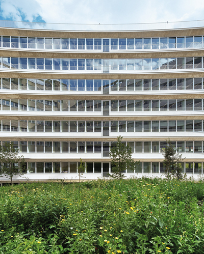 L’une des grandes forces de ce projet est son design très créatif, récompensé par le prix de l’Équerre d’argent 2022 – catégorie « Lieu d’activité » –, l’un des plus prestigieux en architecture. Il le doit notamment à ses façades incurvées, bordées de balcons en ailes d’avion en béton brut fini, caractérisées par une sous-face qui s’affine entre la façade et l’extrémité, donnant ainsi au bâtiment sa légèreté aérienne.