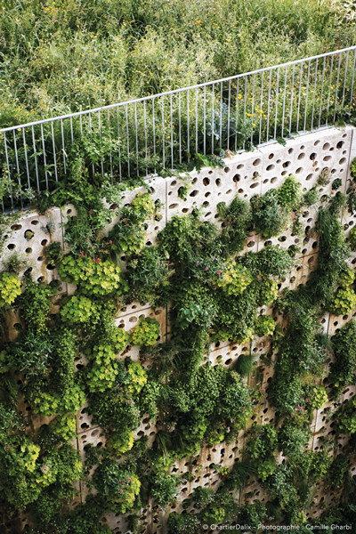 La signature architecturale du site s’exprime aussi dans une paroi béton vivante qui est le résultat d’une recherche menée au sein de l’agence ChartierDalix, mise au point à l’occasion du projet avec l’entreprise de construction CBC. « Le maître d’ouvrage souhaitait que la paroi béton vivante soit végétalisée dès l’inauguration du bâtiment, ajoute David Fiot.