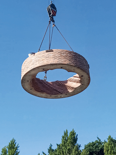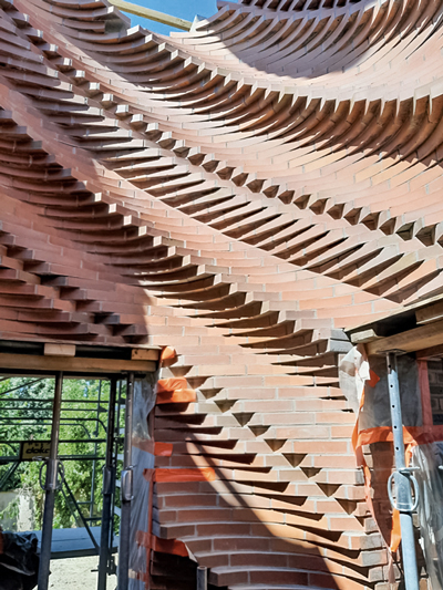 « Pour respecter son design, poursuit-il, nous avons dû commander des briques sur mesure en huit modules différents afin de reproduire la forme de la vis, que nous avons mises en œuvre en suivant les armatures métalliques circulaires, avec un joint très régulier et un petit décalage de 3 cm à chaque rang. » Pour cet ouvrage monumental, chaque tour de vis complet est réalisé sur 5 m de hauteur.