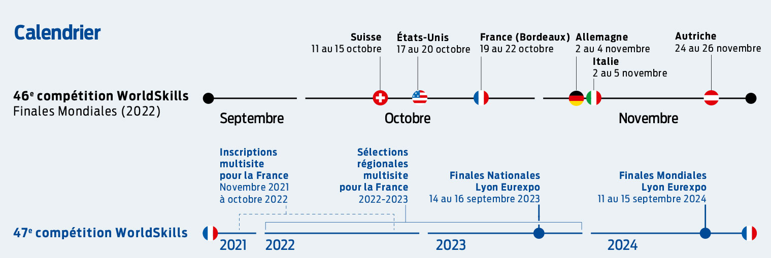 Cette « fraction » de Finale Mondiale, toujours rythmée sur trois jours, du 19 au 22 octobre 2022, se tiendra à Bordeaux, en même temps que les sélections régionales de la Nouvelle-Aquitaine pour la 47e édition des WorldSkills, programmées du 20 au 22 octobre. Outre les compétiteurs, les entraîneurs et partenaires, près de quarante-cinq mille visiteurs sont attendus pendant ces quatre jours intenses. Comme lors des précédentes éditions, les médaillés tricolores devraient être reçus à Matignon et/ou à l’Élysée. Pour mémoire, le Gouvernement a soutenu et défendu en 2019 la candidature de la France pour accueillir la compétition internationale WordSkills 2023 (désormais 2024) dans la capitale des Gaules.