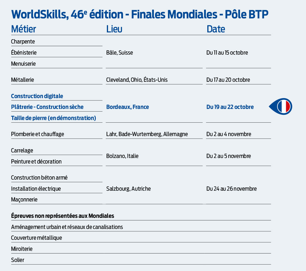 Après des échanges nourris et enthousiastes, la soixantaine de pays membres du réseau WorldSkills a trouvé, en un temps record, une solution partagée pour que la 46e édition sorte par le haut de ce contexte international perturbé. Concrètement, la compétition, qui regroupe désormais soixante et un métiers, sera déclinée dans quinze pays membres, principalement l’Autriche, la Finlande, la France, l’Allemagne, la Corée du Sud et la Suisse, tandis que son calendrier s’étalera du 15 octobre au 17 novembre 2022. D’autres pays, comme le Canada, le Japon, l’Italie, le Royaume-Uni ou encore les États-Unis ont également été désignés pour accueillir quelques métiers en lice. À noter que les épreuves des treize métiers du bâtiment se dérouleront quasi exclusivement en Europe (voir tableau).