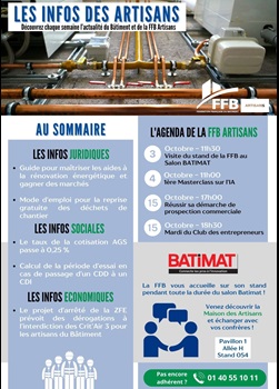Retrouvez chaque semaine notre newsletter « Les Infos des Artisans » et ne manquez plus aucune actualité du bâtiment et de la FFB Artisans.