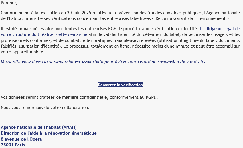 De nombreuses entreprises ont reçu un mail envoyé par « Agence nationale de l'habitat – ANAH [email protected] » portant en objet « Contrôle nécessaire pour maintenir votre label RGE » :