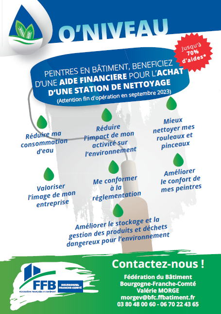 La FFB BFC se mobilise aux côtés des peintres en proposant un dispositif clé en main dans lequel les peintres pourront se doter d'équipements techniques performants et adaptés à leurs besoins. Elle vous accompagnera dans l'accès à une aide financière de 70% proposée par l'Agence de l'Eau Rhône Méditerranée Corse.