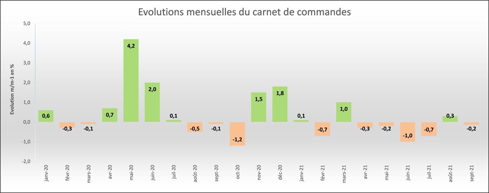 Les carnets de commandes du mois de septembre 2021 diminuent légèrement par rapport à août 2021.