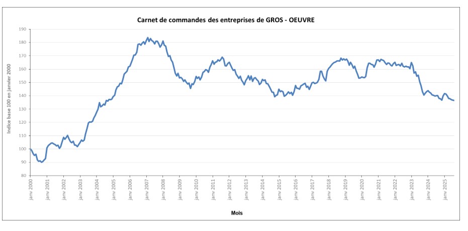 Vous trouverez ci-dessous les variations mensuelles des carnets de commandes1 des entreprises de gros œuvre pour les mois de janvier 2024 à août 2025.