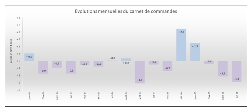 Vous trouverez ci-dessous les variations mensuelles des carnets de commandes1 des entreprises de gros œuvre pour les mois de janvier 2024 à avril 2025.