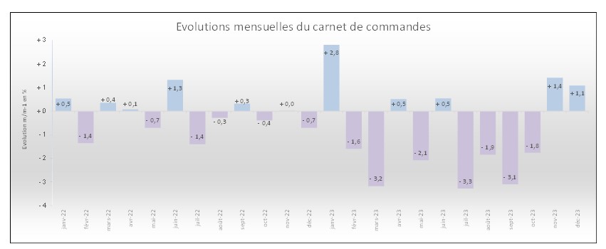 Vous trouverez ci-dessous les variations mensuelles des carnets de commandes1 des entreprises de gros œuvre pour les mois de janvier 2022 à décembre 2023.