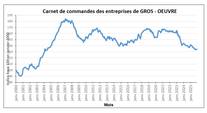 Vous trouverez ci-dessous les variations mensuelles des carnets de commandes1 des entreprises de gros œuvre pour les mois de janvier 2024 à décembre 2025.